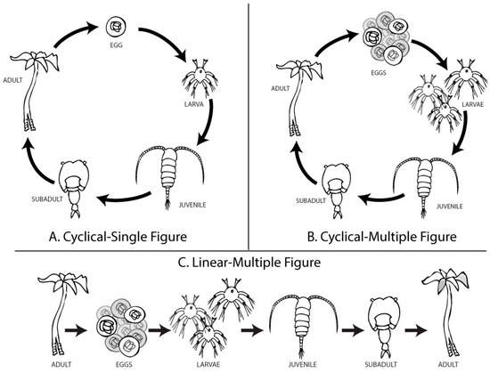 Three distinct diagrams were developed to visualize an organism’s life progression. (A) The Cyclical–Single (CS) figure used characteristics common to textbook figures showing a “life cycle”. (B) The Cyclical–Multiple (CM) figure was modified to reflect the concept of over-reproduction, with 10 eggs, 3 larvae, and 1 representative of each further life stage. (C) The Linear–Multiple (LM) figure was identical to the CM figure but was arranged from left-to-right, starting and ending with adults. Each adult, each egg, and each larva displayed very slight variations in phenotype. A comparison between CS and CM figures isolates the independent variable, the number of offspring. A comparison between CM and LM figures isolates the independent variable, the layout.