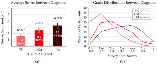 Overall scores were highest when students used the Linear–Multiple (LM) figure, with an average of 3.3 out of 6 questions correct. Students who received the standard Cyclical–Single (CS) figure scored the lowest average total, at 1.6 out of 6 questions (Figure 3a). These scores were significantly different between groups (p < 0.001).