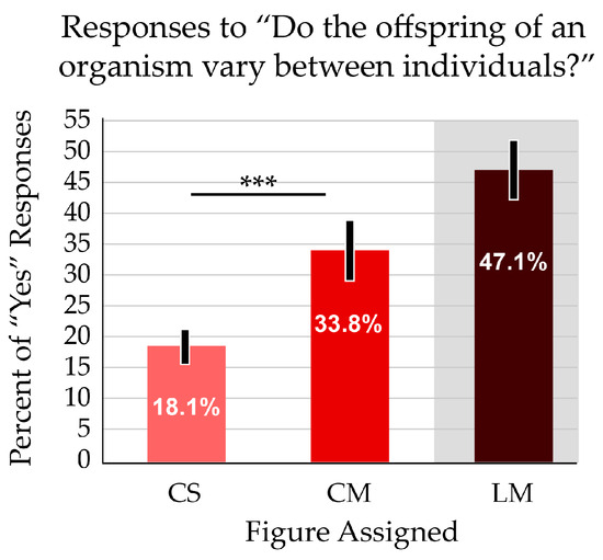 Another concept addressed by the different numbers of offspring (CS and CM figures) was variation among offspring. Genetic diversity within a cohort is foundational for both ecological and evolutionary thinking. Participants were almost twice as likely to report that offspring varied among individuals when presented with the image that showed multiple offspring. The difference was significant (p < 0.001) (Figure 5). The linear layout (LM) resulted in a further improved average score on this question. The additive effect of this confounding variable is addressed below, in Section 3.4.