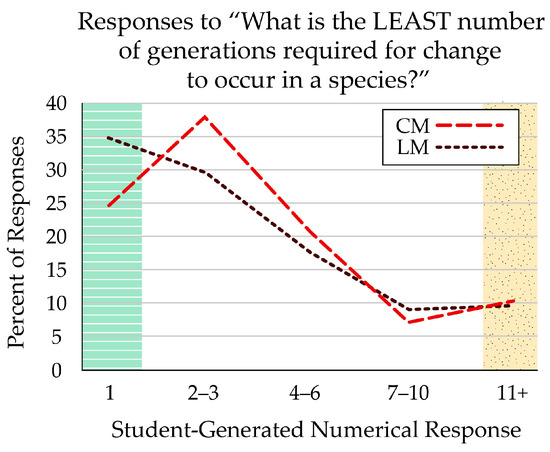 Students who received the linear-format figure (LM) were most likely (34.6%) to respond that just one generation was required for evolutionary change in a species. Fewer students (24.5%) who received the cyclical-format figure (CM) responded with one generation, though most thought it would take two or three generations. Both formats had similar percentages of students who responded that it would take more than 10 generations for species change to appear. The green, striped zone indicates answers that reflect prevalence in nature, marked as correct; the yellow, stippled zone indicates answers that reflect common misconceptions.