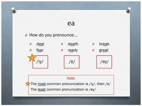 Lesson 1 focused on consonants and used direct instruction to review common consonant grapheme–phoneme correspondences (GPCs). These included the ‘hard’ and ‘soft’ pronunciations of <c> and <g> as well as ten consonant digraphs: <ck>, <ch>, <ph>, <sh>, <th>, <wr>, <qu>, <kn>, <ng>, and <wh>. Each digraph was presented on a slide along with how many pronunciations it has, what those pronunciation(s) are, example words containing the digraph, and any notes regarding their occurrence (e.g., that <ck> only occurs in the middle or at the end of a word, or that /tʃ/ is the most common pronunciation of <ch>). Participants were also introduced to the concept of keywords, or high-frequency words with common spelling patterns, which they could use as the basis for making analogies between unfamiliar and familiar words. For example, the keyword rock could be used to help decide the pronunciation of the unfamiliar word shock, and participants had the opportunity to practice with the keywords in a partner activity before the end of the lesson. The assigned homework asked participants to sort a list of words based on how their consonants were pronounced (specifically targeting hard vs. soft <c> and <g>) and to find examples of and analyze words from their assigned class reading that contained the digraphs covered in the lesson.