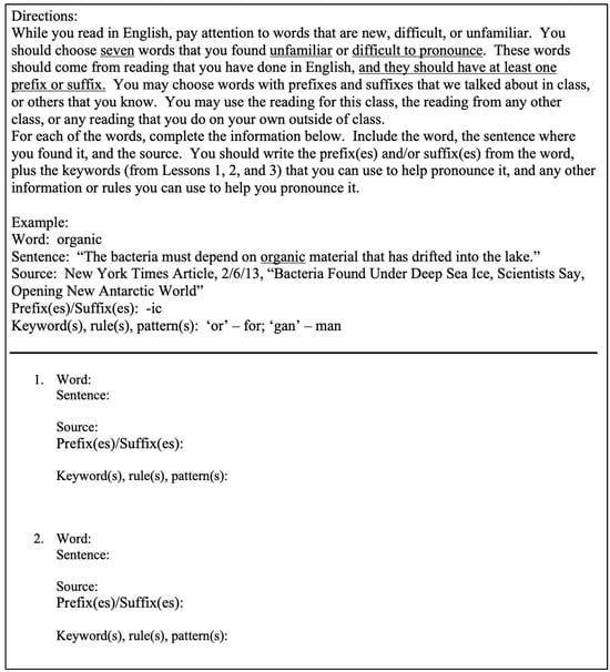 Lesson 3 focused on introducing basic English morphology and the concepts of word roots and affixes. Participants reviewed common prefixes and suffixes and discussed their meanings and how they affected the pronunciation of the word root they attached to. The targeted affixes were <em->/<en->, <-ic>, <in->/<im->/<il->/<ir->, <-able>/<-ible>, <dis->, <-ion>/<-sion>/<-tion>, <-ive>, and <re->; these were chosen because they are among the more common higher-level affixes with spelling and pronunciation variations that may be challenging for L2 English learners [118]. Participants also practiced identifying affixes in words, separating them out in multimorphemic words, and using strategies they were already familiar with to decode the root. There were also two homework assignments following Lesson 3. The first asked participants to identify words with roots and affixes from their assigned class reading that were unfamiliar or difficult to pronounce and to choose keywords to help them read these words; the beginning of this assignment can be seen in Figure 3. The second provided participants with a paragraph from their assigned class reading that contained a number of words that could be correctly read with the help of the strategies participants had been practicing. Participants were asked to record themselves reading this paragraph aloud and teachers provided general feedback on their pronunciation of the targeted words.
