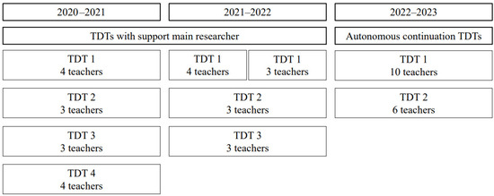 A longitudinal research design inherently poses the risk of participant attrition throughout the study period [34]. This long-term study also faced instances of participant dropouts over its three-year duration. Figure 2 shows the participating TDTs and teachers during the three-year research period. Throughout the research period, TDT 4 decided to end its participation after the first school year (2020–2021), and TDT 3 decided to end its participation after the second school year (2021–2022). Starting from the second trimester of the 2021–2022 school year, TDT 1 had one less teacher participating. During the school year 2022–2023, TDT 1 and TDT 2 opted to proceed autonomously. Despite some teachers ending their participation, new teachers also joined the TDTs. Appendix B delineates the demographics of the teachers for each school-based TDT during the school year 2022–2023.