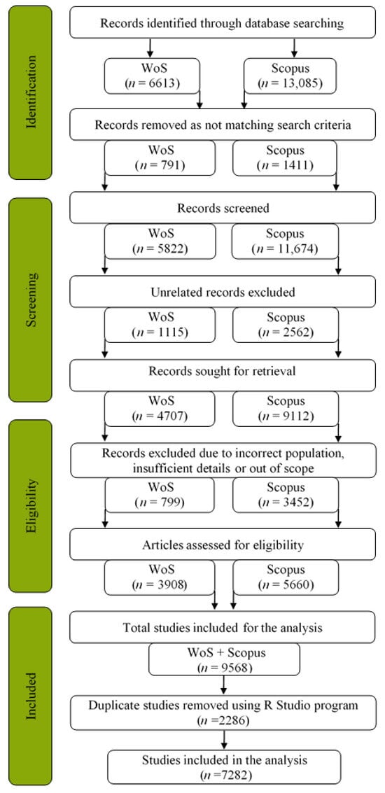 The process of data search is presented in the Figure 2 PRISMA diagram [38]. The initial search was conducted on 1 April 2023, which yielded 13.085 documents from Scopus, and 6613 from WoS (19,698 in total) documents. Criteria for including documents to be further analyzed from this large set were based on the following criteria: