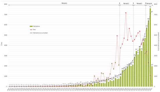 The metadata uploaded to the SciMAT program was first submitted to bibliometric performance analysis. This analysis (Figure 4) calculated the yearly distribution of publications over all periods of analysis, citations received, and the accumulated number of publications.