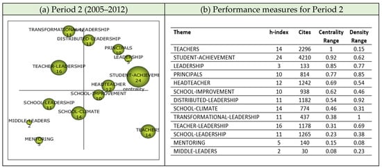 The emerging theme of Period 1, STUDENT-ACHIEVEMENT, became one of the motor themes of the second period. This signifies the beginnings of what became an enduring focus on whether and how school leaders contribute to their students’ success. Among the subthemes associated with Student Achievement, Teacher Self-Efficacy, Teacher Motivation, Self-Efficacy, Classroom Management, Principal Leadership, School Performance, Students, and School-Leaders stand out. Two seminal papers published during this period investigated the effects of leadership on student achievement, one by Robinson et al. [47] and one by Leithwood et al. [48]. As Table 4 indicates, these two publications were widely cited by educational leadership researchers and their findings are likely to have encouraged this line of research during Period 2.