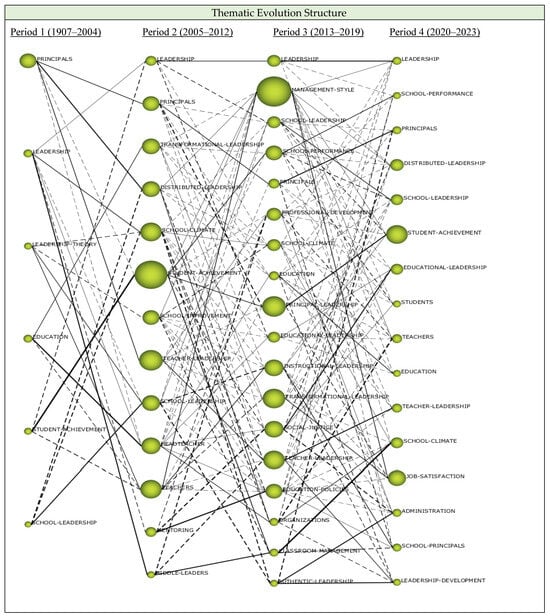 This study aims to describe the century-long trajectory of educational leadership research (ELR), including changes over time in its main and subsidiary themes, as well as its most influential authors, papers, and journals. The study combines the bibliometric performance and science mapping analysis of 7282 articles retrieved from the Scopus and WoS databases. SciMAT software (version 1.1.04) was used to analyze changes over four sequential time periods and to exhibit the thematic evolution of the field—Period 1 (1907 to 2004), Period 2 (2005 to 2012), Period 3 (2013 to 2019), and Period 4 (2020–2023). Research during Period 1 focused on principals and included efforts to distinguish between their administrative functions and forms of ‘strong’ leadership contributing to school improvement. Period 2 included research aimed at understanding what strong principal leadership entailed, including the development and testing of more coherent models of such leadership. While instructional and transformational leadership models were prominent during Periods 1 and 2, Period 3 research invested heavily in conceptions of leadership distribution. Early research about ‘social justice leadership’ appeared during this period and eventually flourished during Period 4. While principals were an active focus through all Periods, the leadership of others gradually dominated ELR and accounted for the broader leadership theme found in all four periods. The results point to the evolutionary nature of ELR development, which eventually produced a relatively robust knowledge base. Experiences with the COVID-19 pandemic suggest that crises such as this might prompt more revolutionary orientations in the ELR field.