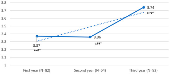 The results seen in Figure 1, show differences in the sense of belonging and mission according to school year. The dotted line describes the trend from Year 1 to Year 3.
