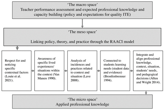 Our findings underline the value added to teacher capacity building during ITE and beyond through the strategic planning of a theoretical framing. In this respect, we summarize our findings in a teaching-capacity-building model, framed by teaching and learning theories that embrace context-consciousness and emphasize respect, awareness, analysis, connectedness, and integrated knowledge (RAACI model; Figure 1). This capacity-building model utilizes the following five main strategies highlighted by empirical evidence: (i) noticing the contextual factors in which teaching takes place; (ii) fostering the awareness and differentiation of specific incidents/situations within different contexts; (iii) analyzing incidents and lived experiences as ongoing processes towards deeper understanding; (iv) developing connectedness with the students; and (v) integrating knowledge of context, content, and situations with students’ needs to improve learning. These capacity-building strategies improve teaching with context-consciousness. Drawing from the work of Bronfenbrenner’s (1994 [20]) ecological system theory as a foundation and supported by the Vygotskian theoretical frame of socio-cultural teaching and learning, the RAACI model offers a framework to support improvement in professional knowledge and graduating teachers’ capacity building. The model shows that the synthetic intersection between the macro-contextual space (“macro-space”) and the meso-contextual and enacted pedagogical space (the “meso-space”, i.e., the RAACI space) is deeply embedded in socio-cultural teaching and learning theory (Vygotsky 1978 [11]) and supported by Van Manen’s (1990 [18]) attention to lived experiences; their synthesis culminates in the third micro-space of individual lived experiences and, hopefully, career satisfaction (the micro-space, the final horizontal level, embraces “applied pedagogical knowledge”). In summary, the socio-cultural theoretical framing of the RAACI model incorporates transnational considerations about applied professional knowledge to inform sound pedagogical reasoning and address teaching and learning needs within specific contexts.