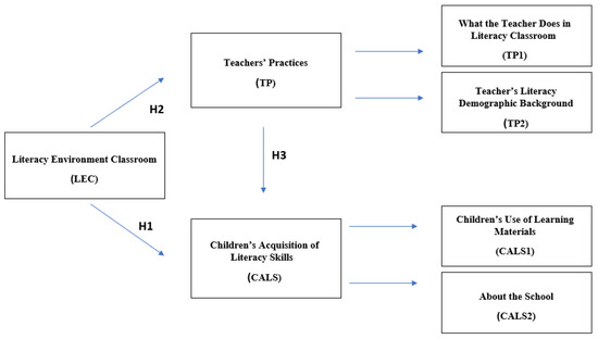 A structural equation model was developed to explain the causal relationship between literacy classroom environment (LEC), children’s acquisition of literacy skills (CALS), and teachers’ practices (TP) in terms of influencing children’s performance. This relationship was inferred from the conceptual model, which determined that literacy classroom environment (LEC) is the independent variable, while children’s acquisition of literacy skills (CALS) is the dependent variable. Teachers’ practices (TP) are the mediator variable. However, the close relationship between these variables means that each of these variables has a mediating influence on the other Civelek [54]; Whittaker and Schumacker [55]. For instance, literacy classroom environment (LCE) had a significant connection or impact on teachers’ practices (TP) and children’s acquisition of literacy skills (CALS). Therefore, the conceptual model was adapted to represent the dual influences between the variables.