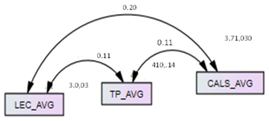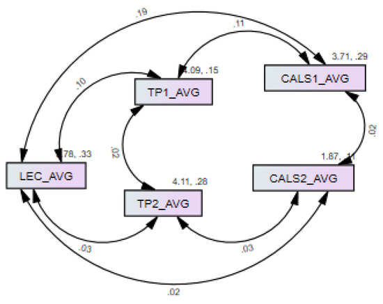 Each of the three constructs had several items. The literacy classroom environment (LEC) variable had 7, children’s acquisition of literacy skills (CALS) had 11, and teachers’ practices (TP) had 18 items. An SEM derived from each of these items could not be determined as the correlation matrix was not positively definite [53]. As a result, five new variables were calculated by averaging the items in each construct. The new variables were LEC_AVG, TP1_AVG, TP2_AVG, CALS1_AVG, and CALS2_AVG. These computed variables were used to determine the relationship between the three constructs. Figure 2 shows the resulting structural model for the dataset.