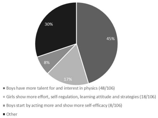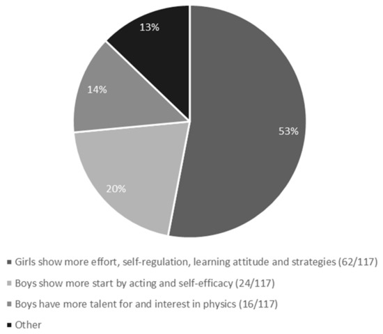 Prior work has shown that gender differences are present in education [2,3,4,5,6,7]. The focus of most studies has been on differences in career paths and achievements, but less is known about the perspectives of teachers and students on gender differences. Therefore, the present study aimed to investigate students’ and teachers’ views on gender differences in the Dutch upper secondary physics classroom. By asking them to describe their own experiences, we received rich content and valuable insights. The first outcome was the observation that students’ open-ended answers were more straightforward, whereas teachers elaborated more. Therefore, teachers’ answers could be analyzed with a more varied set of codings than students’ answers. The elaborated answers of physics teachers and students on an open-ended question were first categorized into two main factors: students’ learning characteristics and teacher–student interactions. The largest part of the answers was concerned with students’ learning characteristics, in which three categories could be distinguished: talent and interest in physics, way of learning and behavior in class. A smaller part of the answers was in the area of teacher–student interactions. In addition, a number of answers commented on classroom composition, mainly stating that there were more boys than girls in the classroom.