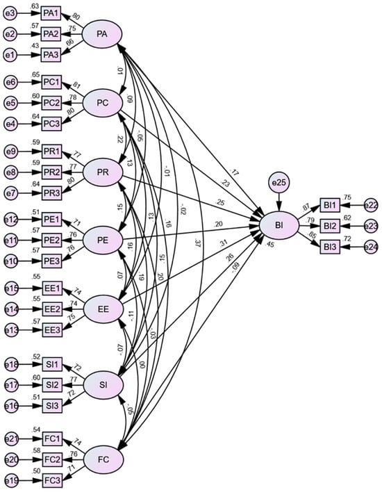 Lastly, to further investigate the construct validity, a measurement model was developed utilizing Amos. The model’s fit was evaluated by calculating seven goodness-of-fit indices, including the Comparative Fit Index (CFI), Normed Fit Index (NFI), Incremental Fit Index (IFI), Root Mean Square Error of Approximation (RMSEA), Tucker–Lewis Index (TLI), Parsimony Normed Fit Index (PNFI), and Standardized Root Mean Squared Residual (SRMR). As illustrated in Table 3, the model demonstrated a good fit with the data, as all indices satisfied the recommended benchmark values [24,25,27].