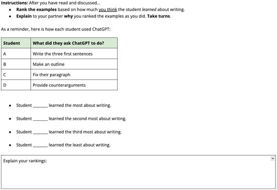 | Video | Paired discussion of rankings and rationales | n = 0 | n = 6 |