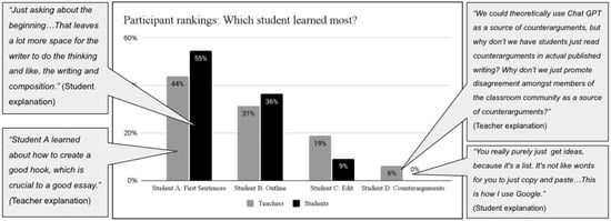 | Models | Seeing models or examples and transferring new knowledge to their own writing. | Student B [outline prompt] learned the most about writing because a lot of students don’t know what an outline looks like or how to structure their ideas. |