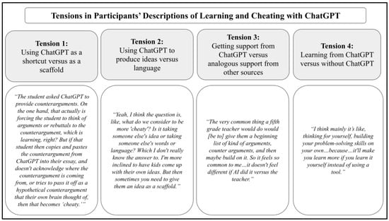 Chicago/Turabian StyleMah, Christopher, Hillary Walker, Lena Phalen, Sarah Levine, Sarah W. Beck, and Jaylen Pittman. 2024. "Beyond CheatBots: Examining Tensions in Teachers’ and Students’ Perceptions of Cheating and Learning with ChatGPT" Education Sciences 14, no. 5: 500. https://doi.org/10.3390/educsci14050500