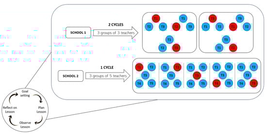 At the end of the modelling phase, a comprehensive discussion was initiated involving all participants. This conversation focused on potential improvements and suggestions, recommendations for future sessions, detailed explanations of the methodologies used, and strategies for better lesson organisation. The dialogue was designed to collect diverse perspectives to refine and enhance the teaching approach to equip teachers with insights and experience to handle various scenarios that they might encounter when designing their lessons. The final phase of the workshop focused on learning outcomes; participants were divided into groups, including triads and groups of five. Together, they specified the learning outcomes for topics in mathematics, science, and technology. The objective was to incorporate and enhance the lesson plans by emphasising the spatial ability insights gained from earlier inputs. This collaborative effort was aimed at integrating these new competencies into teaching strategies, thereby enriching the educational experience with a stronger focus on spatial reasoning. In the context of the IMTP framework, the workshop phase largely adhered to three principles: first, insights about teaching spatial ability were instilled through input and modelling; second, goals for teachers were motivated through reflection and discussions; and third, techniques were fostered through the formulation of lesson plans and reflection. After each workshop, participants in the PD programme engaged in a structured process of LS according to the framework proposed by Lewis et al. []. In one school, teachers formed triads comprising three members, whereas in the other school, due to a larger number of teachers, groups of five were formed (as illustrated in Figure 2).