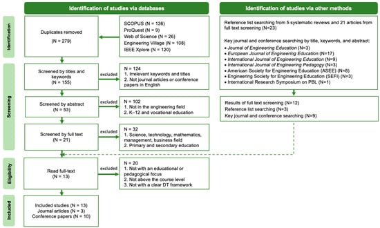 The initial search of the four databases resulted in 279 relevant articles. After 120 duplicates were removed, 155 studies remained for further screening. The first phase of abstract and keyword screening reduced the number to 53. Next, in the abstract screening phase, two of the authors made decisions independently on whether the articles should be included, using the same Microsoft Excel template documenting the inclusion criteria. As a result, 32 articles were removed, reducing the number of studies in the remaining sample to 21. To ensure that no relevant published studies were missed in the electronic search, following Booth et al.’s [25] suggestion, additional manual searches were conducted by checking the reference lists of the selected sources and five systematic reviews related to DT [2,22,23,29,30] and searching key journals and conference papers in the engineering education field. The former method resulted in three additional articles, while the latter strategy yielded nine. Each screening phase was conducted twice to ensure that no relevant studies were mistakenly excluded. Following this, 12 additional studies were deemed eligible for inclusion in the next phase. In total, 20 out of 33 articles were excluded following full-text reading because they did not meet the inclusion criteria of including a clear DT model/framework, being situated above the course level, and focusing on educational and pedagogical insights. Ultimately, 13 studies were included for further analysis, comprising 10 conference papers and 3 journal articles.