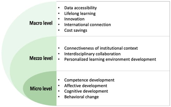 The macro level focuses primarily on the promoted pedagogical outcomes. The results of the 13 included studies show that DT should give more people (including students, teachers, experts, employers, professionals, and regulatory organizations) access to online data and resources [33,34,35,38,39,42,45], encourage lifelong learning [33,43], and create a new digital culture [45]. Moreover, it should promote technological and pedagogical innovation in learning practices, educational management, and communication from a broader sociocultural perspective [40,42,44,45]. Technically, DT supports institutions to invest in developing their IT infrastructure and to improve technology use, monitoring, control, design, and programming [43]. Economically, DT also entails benefits such as cost savings and increased profitability, resource efficiency, and productivity [33,34,35,37,38,39,43]. DT has also been reported to improve the international applicability of online resources, promote global citizenship, and increase the emphasis placed on addressing global challenges [38,39,40].