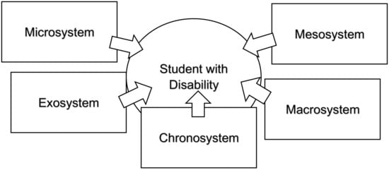 In this study, we were guided by two theoretical frameworks. First, for students with disabilities, we assumed Bronfenbrenner’s bio-ecological model, which adopts a student-centred approach to support. Bronfenbrenner’s theory states that the student’s development is influenced by the following systems: the microsystem, mesosystem, exosystem, and macrosystem. In this study, we adopt these systems as critical for students with disability support within the college environment. The microsystem entails factors in the immediate student environment, and the macrosystem is composed of institutions that may impact students, such as relationships between students with disability and family, teachers, and fellow students. The exosystem includes factors beyond the college, such as non-governmental organisations that have a vested interest in TVET education. The macrosystem entails societal aspects such as the economy, sociocultural conditions, and other community factors that have an impact on the educational support of students with disabilities. Figure 1 shows the centrality of the student with disability within the college environment and community.
