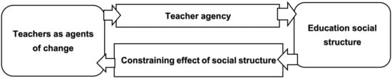 Secondly, concerning the college teachers, we understand that the college and its environment should provide the necessary conditions for support. As a result, we adopted the Structuration Theory of Giddens [24]. Giddens [24] suggests there is a relationship between agents, agency, and social structure. There is an interplay of influence between the constraining effect of the social structure and the agency applied by agents within the social structure. This he calls the “duality”. In this study, we assume that teachers are agents of change, and through their agency, they can change the social structure—the education of students with disabilities—and as such create an environment conducive to educational support. We are also aware of the constraining effect of the college environment as a social structure on the ability of teachers to navigate the barriers of support for students with disabilities. Figure 2 illustrates the relationship between teachers as agents, their agency, and the social structure.