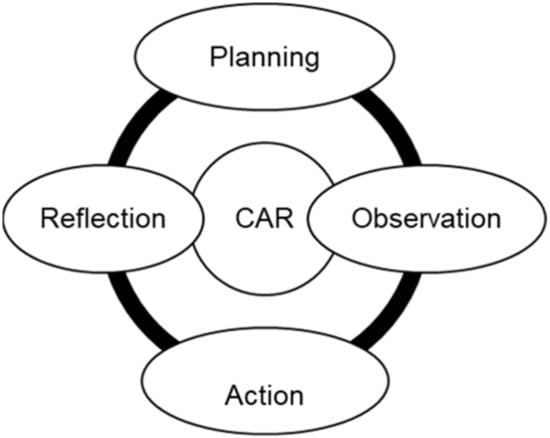 We embarked on CAR as a goal-oriented process that consists of identifying the issue to be addressed, forming a plan to solve the problem, collecting the data that reflect the data on the effects of the action, reflecting on the results of the action, and creating actions to be taken [26,27] (p. 1).