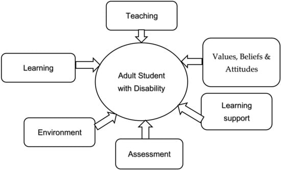 The analysis of data has demonstrated that the practices of inclusion for students with disabilities in the Kazakhstani college context were based on six key strategic areas, i.e., teaching, learning, environment, assessment, learning support and values, beliefs, and attitudes. Figure 4 below depicts the relationship between the six areas and their ecosystemic influence on the support of a student with a disability.