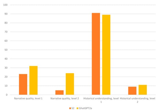 This assessment differentiated between basic descriptive elements and more sophisticated stylistic devices, including metaphors, similes, hyperboles, and idioms, categorizing the texts into two levels of narrative quality (level 1 and level 2) based on their complexity, with the first level categorizing predominantly using simpler techniques, and the second level encompassing texts with a robust presence of complex stylistic elements. NVivo was utilized to extract percentages representing the prevalence of different coding elements (historical stance orientations, and basic versus sophisticated devices). The analysis culminated in a cross-comparison of the distribution of codes related to historical understanding and narrative quality, respectively. These distributions were visually represented through pie and bar charts, integrating qualitative analysis with quantitative data representation for a comprehensive understanding of the data. To simplify data visualization, coded files from NVivo were exported to Excel. Subsequently, the graphs generated in Excel were then formatted using PowerPoint, to improve their readability. The resulting visualizations are presented in the following section.