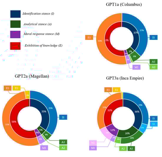 In its use of basic stylistic features, such as adjectives or evaluative language, text S2 resembled text GPT2a, albeit lacking in metaphors and similes. In terms of historical understanding both texts were on par. In each text, an individually oriented identification stance (I1) was prominently displayed, which is reasonable given the writing task. The exhibition stance, with an individual orientation (E1), was more prominent in S2 (42%) than in the much shorter GPT2a (33%), indicating richer historical detail in the student text.