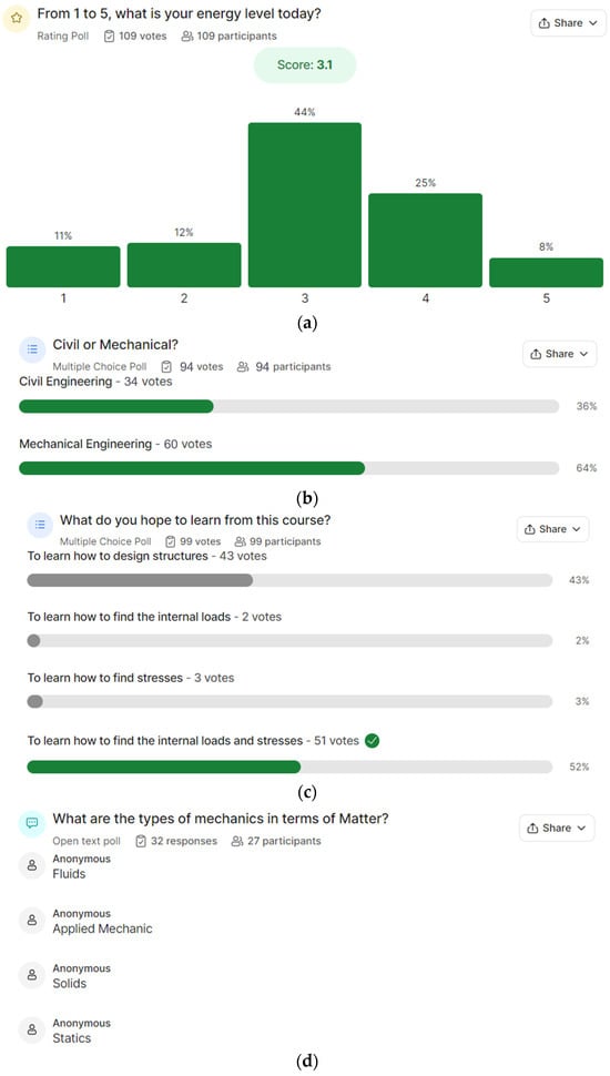 A student who is fully engaged is one who is involved in the learning process, motivated to learn, and actively participates. Engaged students are vital to a healthy classroom environment. When students are invested in the learning process, they are more likely to retain information and succeed. Increased engagement can also lead to better classroom discussion, collaboration, and overall satisfaction with the module. According to the literature, most studies exploring student engagement have focused on face-to-face learning environments, and there is a research gap regarding the impact of online polling platforms on students’ engagement, particularly in engineering disciplines. For example, sometimes, students are present in the classroom but not actively engaged in the learning process [12]. There are some possible explanations for this. For example, students may be struggling to understand the material and may feel discouraged from participating [13]. They may also be afraid of asking questions or making mistakes, particularly in large classes [14,15]. In addition, students may be distracted by their phones, laptops, or other devices [16]. This can make it difficult for them to focus on the class material and participate in discussions or activities. Students may be daydreaming or thinking about something else [17]. This can also make it difficult for them to follow along and engage in the learning process. Finally, students may not be interested in the material or may not find the class engaging [18]. This can result in them being less likely to participate actively in the learning process.