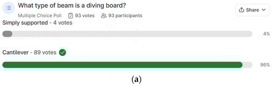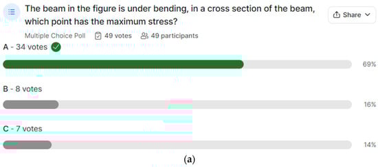 Figure 15a–e shows very interesting findings. Although, in each question, more than 50% of the answers were correct, the questions looked challenging to the students, especially when it came to Figure 15c. This means that the students struggled with the deep concepts in a good way and were left in a position to think and learn. It should be noted that teaching the differences between internal and external forces is always challenging, and the authors believe that the designed polls were very helpful.