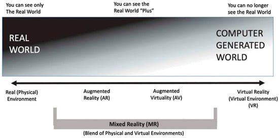 Collectively, VR, AR, and MR technologies represent a spectrum known as the reality–virtuality spectrum, which integrates elements of both real and virtual worlds offering different levels of immersion and interaction between the two [5]. Figure 1 below shows a version of the reality–virtuality spectrum.