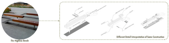 Later, the students were given an online survey form for data collection regarding the relevance of educational materials and likeability. Alongside this, a group of graduate students (n = 7) who were not part of the co-creation process experienced the VR module and gave their feedback through a focus group study. The number of participants for the qualitative study was considered optimum allowing a diverse range of opinions and ensuring each participant had the opportunity to contribute meaningfully to the discussion [73]. The research methodology diagram (Figure 3) illustrates the phases of this study and Figure 4 shows students’ works showcasing their understanding of the construction details of the iconic High Line Park benches.