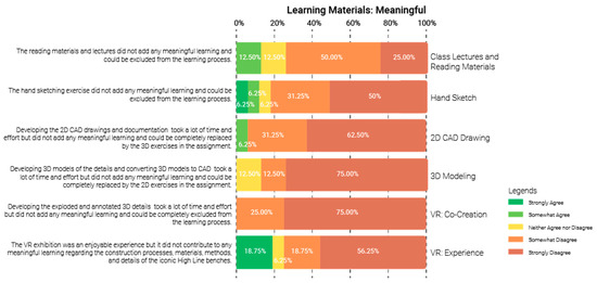 Studies have shown that the integration of XR in design teaching and learning can meaningfully impact learning outcomes. For example, Kerr and Lawson developed an AR prototype, “Master of Time,” to educate first-year landscape architecture students and non-designers on the foundational principles of landscape architecture [34], underscoring the potential of AR to transform learning experiences through digital storytelling and situated experiences and suggesting a new pedagogical approach in landscape architecture education. In another study, Aydın and Aktas [39] emphasize the integration of VR infrastructure in the design of architecture education, highlighting how VR-enhanced design studios can be assessed from a student-centered perspective through exploring software solutions for creating complex virtual environments, indicating that interacting with VR tools in architecture design education can be both attractive and stimulating, despite some challenges related to software complexity. Similarly, this study aims to explore the role and position of XR in teaching and learning the construction of landscape architecture.