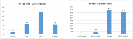 Figure 1 shows the distribution of the four levels of engagement labels in the “in the wild” and DAiSEE datasets. Both datasets share a large difference in the number of data per class by engagement level. In particular, the amount of low engagement, such as “not engaged” and “very low”, is significantly small. The following section explains how this affects engagement estimation in the previous research.