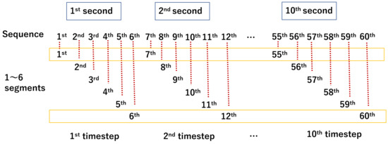From the previous step, we obtained 60 sequences from a sample video. Since the sample videos are 10 s, we set the timesteps to 10, resulting in 6 sequences per second. We then sampled 1 sequence from each second to represent the data for that second. After completing the above process, each sample video is divided into 6 segments, each segment consisting of 10 timesteps. To resample the video data, all 6 segments from videos labeled as “low” were retained in their entirety. In contrast, for videos labeled “high” and “very high”, only the first segment obtained from each second was preserved to form the sample. Figure 3 illustrates the process of oversampling the DAiSEE dataset by segmenting videos into 6 segments. During the data processing phase, some video samples and labels were lost; as a result, we obtained the data presented in Table 4 “Oversample”. Table 4 summarizes the number of original labels and data merged from the “very low” and “low” labels, as well as the sample number after oversampling.