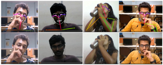 In our study, we used OpenPose [46,47] to extract learners’ facial and body key points, and with these key points, we developed computer-vision-based facial and body expression features to analyze learners’ engagement levels during online learning. Figure 4 shows key points extracted from the raw footage of participants, as provided in the reference paper [10]. It is evident from the images that using the OpenPose method is sufficient to obtain the features in the DAiSEE dataset. Psychologists Ekman et al. developed the Facial Action Coding System (FACS) to understand emotions such as happiness, sadness, anger, surprise, fear, and disgust, each of which is associated with specific facial expressions [23]. However, it is important to note that while there is a significant correlation, the relationship between facial expressions and emotional/affective states can be influenced by context, individual differences, and cultural factors [23,48]. In addition, which facial expressions are associated with which levels of engagement is not precise in recent research studies [2]. In nonverbal communication research, facial and body expressions are crucial channels for conveying emotions, intentions, and attitudes [22]. Similarly, in studies exploring body language expression, Kleinsmith et al. reviewed studies on mapping body features to affective states [22]. They found that the oscillation and movement of body parts such as the arms, head, shoulders, elbows, and hands are strongly correlated with the expression of internal emotions. This research highlights the significant role that the dynamics of body language play in conveying psychological states, underscoring the intricate relationship between physical movements and emotional expressions.