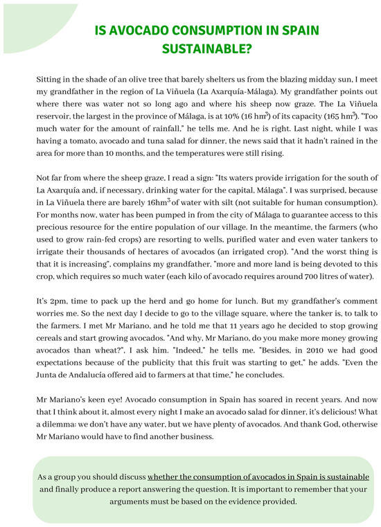 The activity titled ‘Is avocado consumption sustainable in Spain?’ was one of the activities developed during the IG session. Its aim was to enable students to solve cases based on environmental socio-scientific issues by integrating different perspectives, such as environmental, social, economic, political, health, and ethical perspectives. To do this, students must handle information presented in various formats, including textual, numerical, or visual. The activity began by providing students with a brief story (Figure 1), describing a controversial situation regarding avocado consumption in Málaga. Once read, each group was instructed to prepare a report that justified, with reasoned arguments, whether avocado consumption in Spain is sustainable or not.