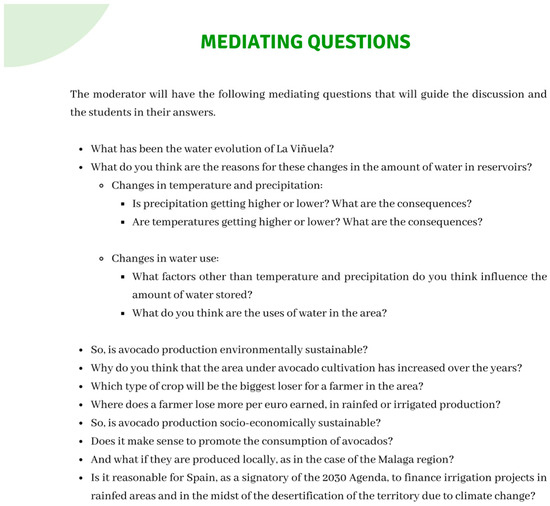 Also, the fact that the facilitator had mediating questions from the beginning of the activity made it possible to direct the discussions and reflections of his or her peers toward the aspects that the teacher considered important to address [51,52]. This is very useful in IG sessions where the teacher remains outside the activity. In this case, the mediating questions helped the students to approach the problem in a systemic way, which leads us to recommend their use in the classroom.
