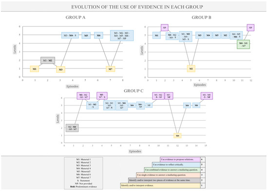 To find out how students in each group identified and used the evidence throughout the activity (objective 1), a category system modified from Esquivel-Martín et al. [43] was designed. The categories used ranged from identifying and/or interpreting evidence (level 1) to using evidence to propose solutions (level 6). Table 2 illustrates the categories by means of speaking turns that show these levels. Thus, in each episode, different levels were observed simultaneously, depending on the turn of speech. However, in the analysis carried out (Section 3.1), each episode was assigned a single level of performance in the use of evidence (the highest level achieved by the group in the episode, considering all speaking turns).