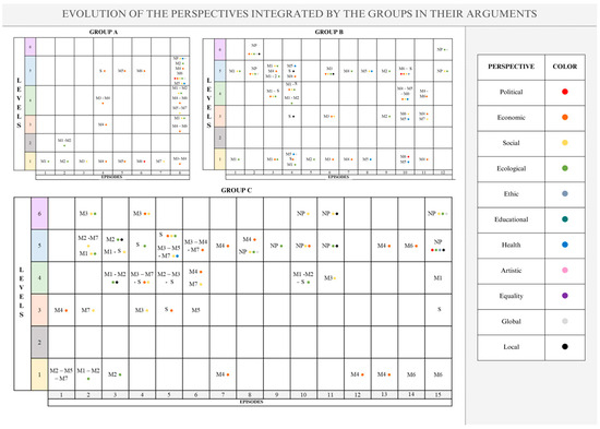 Thirdly, group C included all of the direct perspectives at the different levels of performance on which their discourse focused. By contrast, the indirect perspectives (ethics, health, local, and global) appeared only at high levels (4–6), perhaps because most of their episodes were at levels 5 and 6.
