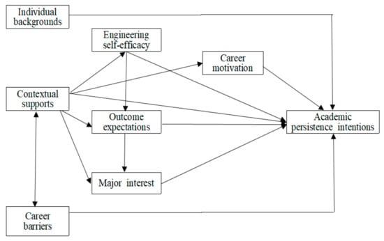 Concerning the factors affecting academic persistence intentions, Gayles and Ampaw [6] found that educational experiences, including faculty interactions and peer social involvement, influenced academic persistence in STEM. Gray and Hackling [33] reported that satisfaction with the learning environment and academic experiences can affect persistence intentions, mediated by self-efficacy. Additionally, career factors such as motivation, exploration, and self-efficacy are closely linked to academic persistence intentions [34,35]. As predictive variables influencing the academic persistence of engineering students, reported factors are based on the social cognitive career theory [18,25,26]: Academic persistence intentions are found to be influenced by environmental factors, including contextual supports and career barriers, with major self-efficacy, encompassing individual interest and outcome expectations, identified as a crucial factor affecting career development and academic persistence [25,26,36,37].
