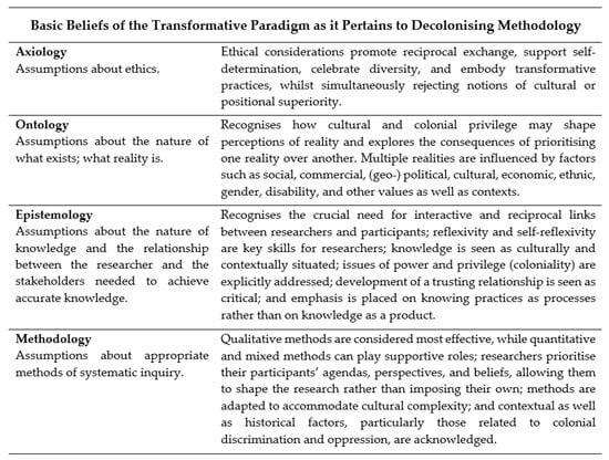 Basic beliefs of the Transformative Paradigm as it pertains to decolonising methodology, drawing on Mertens (1998; 2005).