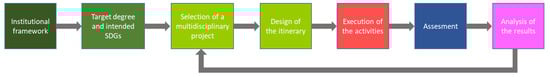 This is a key stage, since selecting a “good” multidisciplinary project is a challenging issue, as it must fulfill several requirements simultaneously. Namely, the project should (1) focus on a real world problem, so students may learn from their experience to face future professional tasks; (2) be relevant to the students, in order to motivate them; (3) require analysis from different perspectives, to promote multidisciplinary solutions that intertwine several activities and (4) present an engaging challenge throughout different courses of the degree. In all, the selected multidisciplinary project becomes a common thread to acquire different skills along several subjects of the degree. One important issue is that the multidisciplinary project must be able to introduce SDGs coherently. In this sense, the work in [] proposes six transformations that may be used to identify problems that group several SDGs.