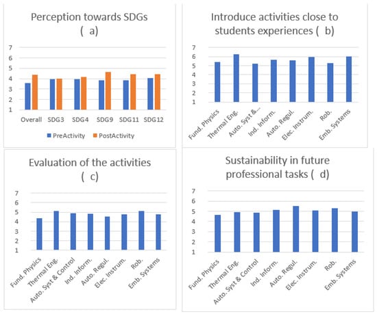 The results obtained after the multidisciplinary experience were, in general, positive since (1) the implementation incremented students’ perception towards the SDGs; (2) students considered that the proposed activities were close to their experiences; (3) the evaluation of the activities was positive in general and (4) students considered that sustainability could become their future professional task. These results are analysed in detail in Section 5.