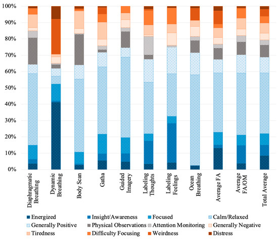 The study findings also demonstrate variation in student experiences between different types of meditations. For example, while reduced stress and increased relaxation are still present across almost all the meditations, the two FA/OM meditations with an emphasis on metacognitive monitoring (i.e., Labeling Thoughts and Labeling Feelings) evoked higher rates of insight, but more students describe difficulties in monitoring their attention. This is not a surprising finding, as open monitoring is considered a more advanced skill typically introduced later in MBIs once participants have had practice with FA meditations [28]. The most unique meditation was the dynamic breathing meditation, as this was the only FA meditation that utilized movement and, consequently, was the only meditation that led to increased emotional intensity. While many students report positive, energizing effects of this meditation, this meditation also led to higher levels of discomfort. It may be less practical to use in large-class settings. Therefore, this meditation may be less effective for stress management. Overall, however, there was a similar breakdown in commonality of experiences with the other meditations, as seen in Figure 1 and Table 3.