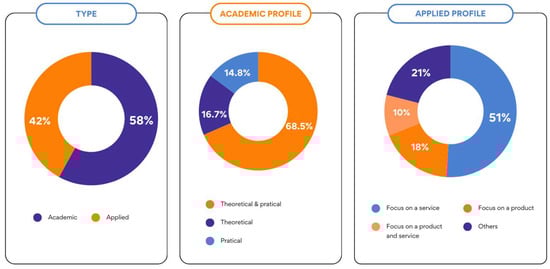 Figure 4 illustrates the distribution of academic outputs (58%), categorizing them into theoretical and practical (69%), theoretical (17%), and practical (15%). When analyzing applied outputs (42%), the focus is on services (51%), products (18%), and a combination of both (10%) and other outputs (21%).