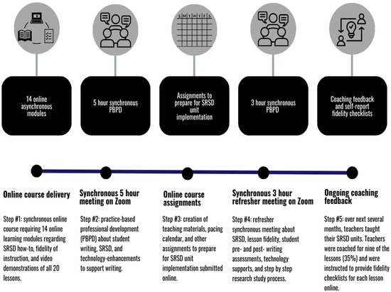 The present study combines best practices for comprehensive PBPD, instructional coaching, and online learning to support teachers’ learning over an extended amount of time (see Figure 1). Online learning is not without challenges, and it is critical that these challenges be accounted for in the online professional development design. Kara et al.’s [30] comprehensive literature review of best practices in online learning found that challenges for adult learners were typically divided into these three categories: internal, external, and program-related challenges. Highly occurring internal challenges can include time management and insufficient computing skills. External and program factors are often not enough time to access materials, limited interaction with other learners, and other technology challenges. In the present study, we used both synchronous and asynchronous online learning with components of Universal Design for Learning (UDL) [29] embedded in the course design. We also provided an extended amount of time to engage with PBPD materials to help mitigate internal, external, and program challenges. Overlapping best practices in UDL, online and adult learning, PBPD, and coaching creates a layered and highly accessible approach to professional learning for teachers. This approach can dramatically impact the effectiveness of PBPD in supporting writing practices such as self-regulated strategy development (SRSD).