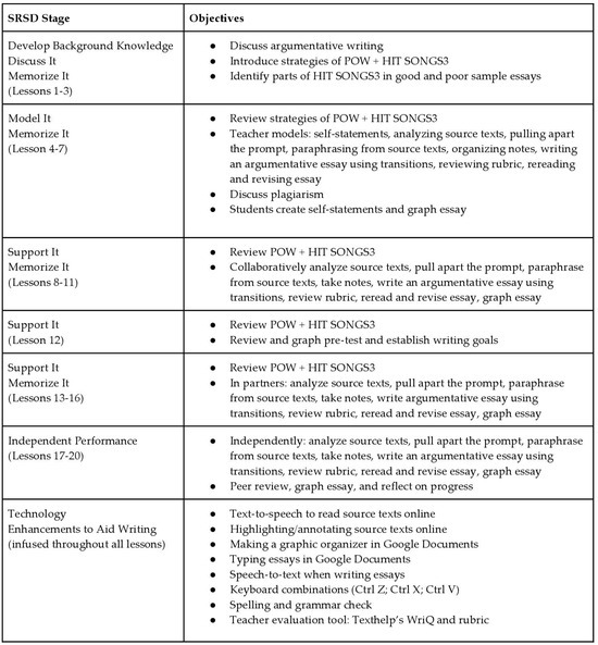 SRSD is an evidence-based practice for teaching writing that includes six stages of instruction, general writing strategies, genre-specific strategies, and self-regulation strategies. The six stages of instruction include the following: develop and activate background knowledge, discuss the strategy, model the strategy, memorize the strategy, support the strategy, and independent performance. The general writing strategies help students remember the steps of the writing process, and the genre-specific writing strategy provides students with an approach for planning their essays within that genre. In this study, teachers taught the general writing strategy POW (Pull apart the prompt, Organize my notes, Write and say more) and argumentative writing strategy HIT SONGS3 (Hook, Introduce topic, Thesis, State perspective, Outlook on perspective, Need decision, Give your opinion, S3: Support your thesis, State relationships, Summary) [31,32,33]. In addition to the genre-specific writing strategy, self-regulation strategies, i.e., self-statements, self-evaluation, self-reinforcement, and goal setting, are infused throughout the six stages to build gradual release and independence for students [34]. Generalization of the writing and self-regulation strategies are also discussed throughout all the stages.