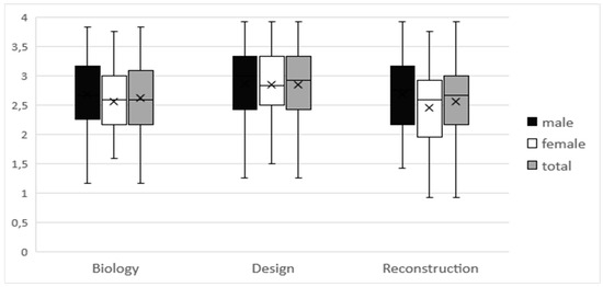 Separated by gender, the ANOVA shows no significant differences for the boys Fboys(2, 204) = 2.255, p = 0.107 η² = 0.022. Similarly, the Tukey post hoc test for differences between the Design group and the other groups remains insignificant (Biology: p = 0.152, Reconstruction: p = 0.182).